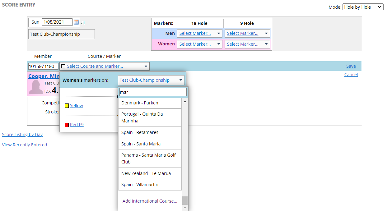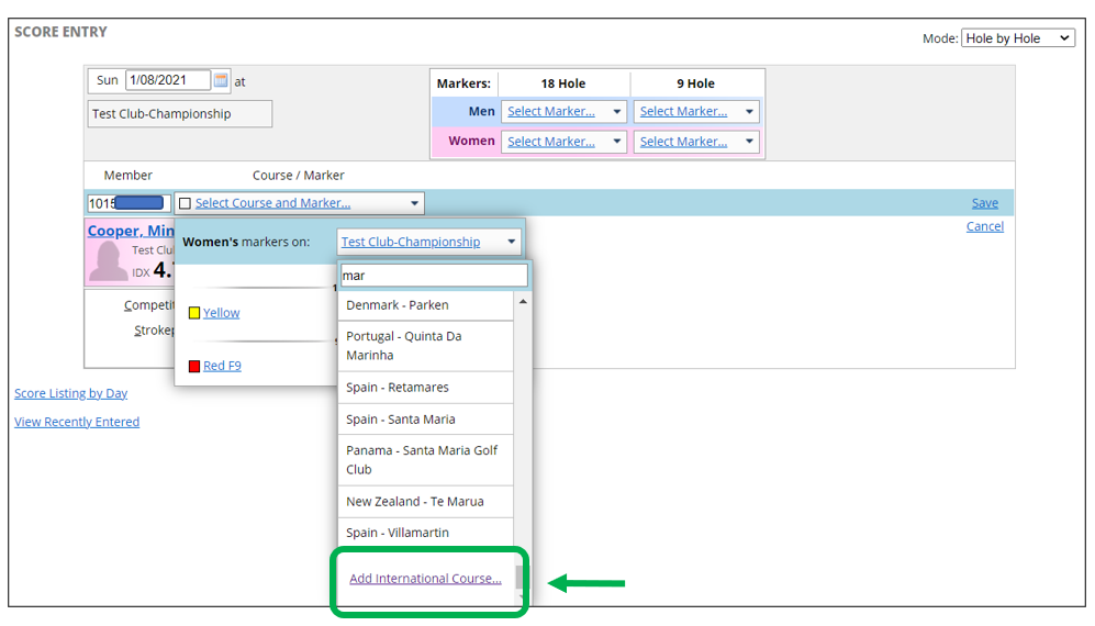 - Select the arrow in the dropdown list for ‘markers’ (Note: the ‘Select Course and Marker’ drop down list will default to those set up for your club):