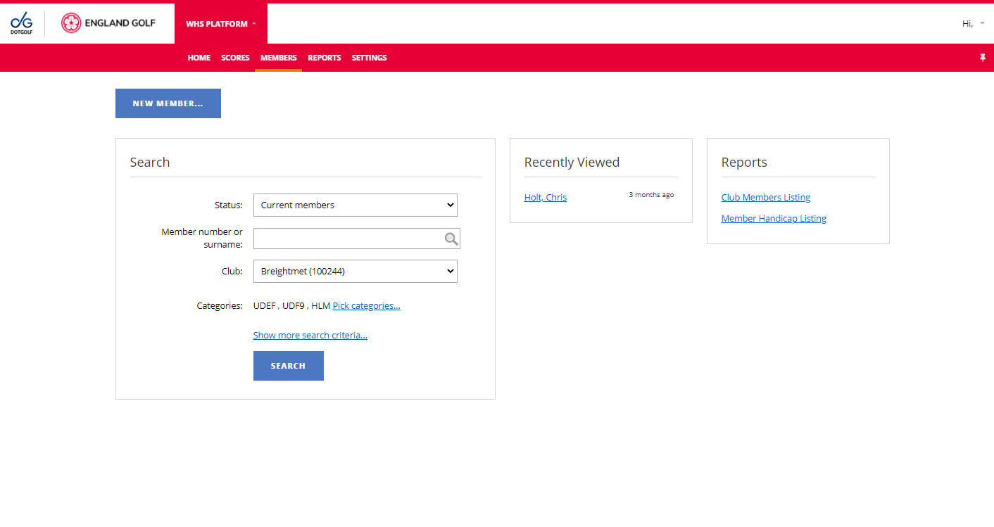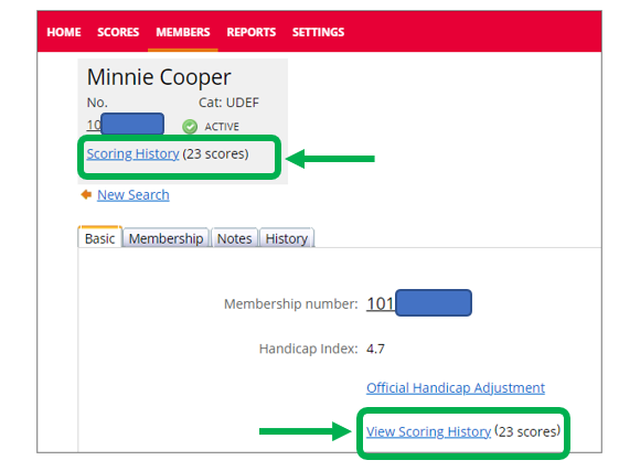 - Member’s ‘Scoring History’ can be selected by clicking the link either via the member overview area or via the basic tab:
