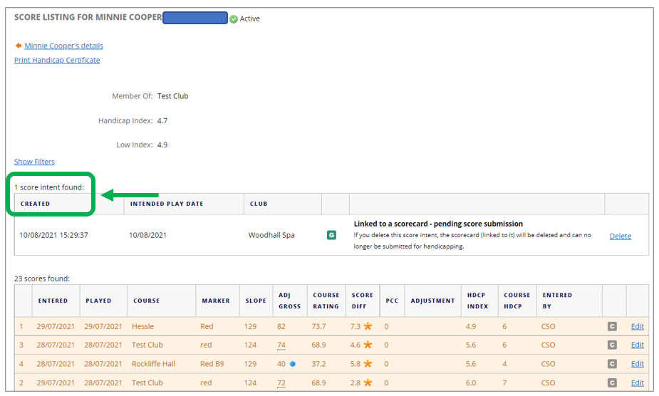 - Delete: You can ‘Delete’ any score intent via the delete link next to the score. Note: this will delete the scorecard from the member’s scoring history, and it will no longer be available to submit/edit later or add to the player’s scoring history. When ‘Delete’ is selected the scorecard is deleted from the members’ ‘Enter Score’ area of the MyEG app. Any deleted score intents can be viewed in the report: Reports: Deleted Score Intents.