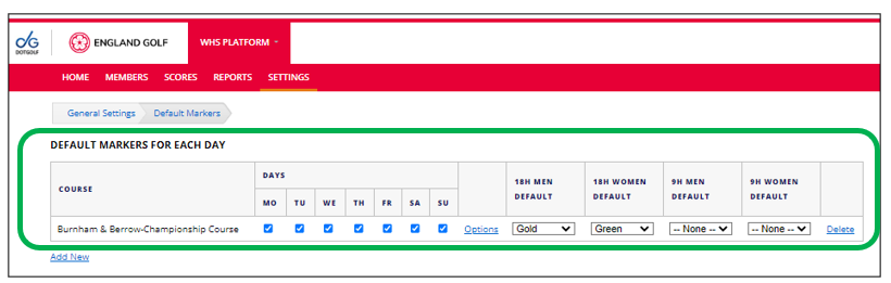 Note: check all your tee sets are set up via 'Default markers', only then will golfers be able to submit a scorecard for them via the MyEG app.