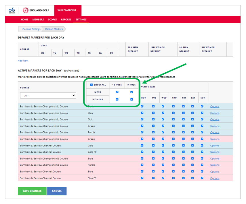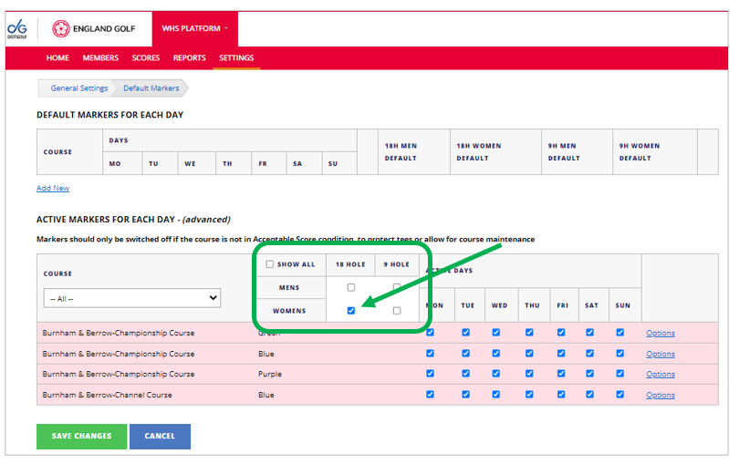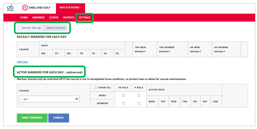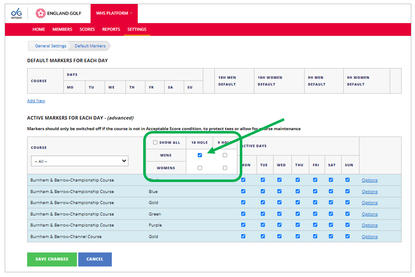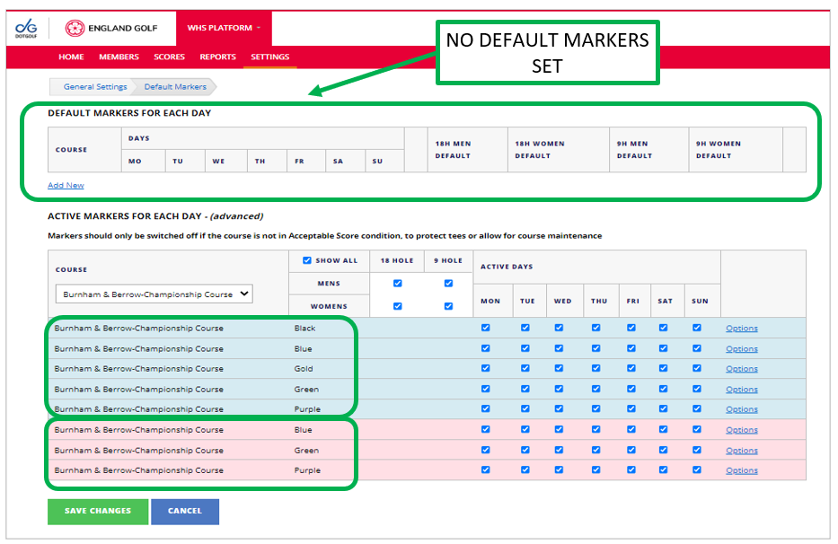 - Note: Ignore the top section ‘Default Markers for each day’ as this is NOT live and does not control the active markers (i.e. it does not select which markers are available for app scorecards download).