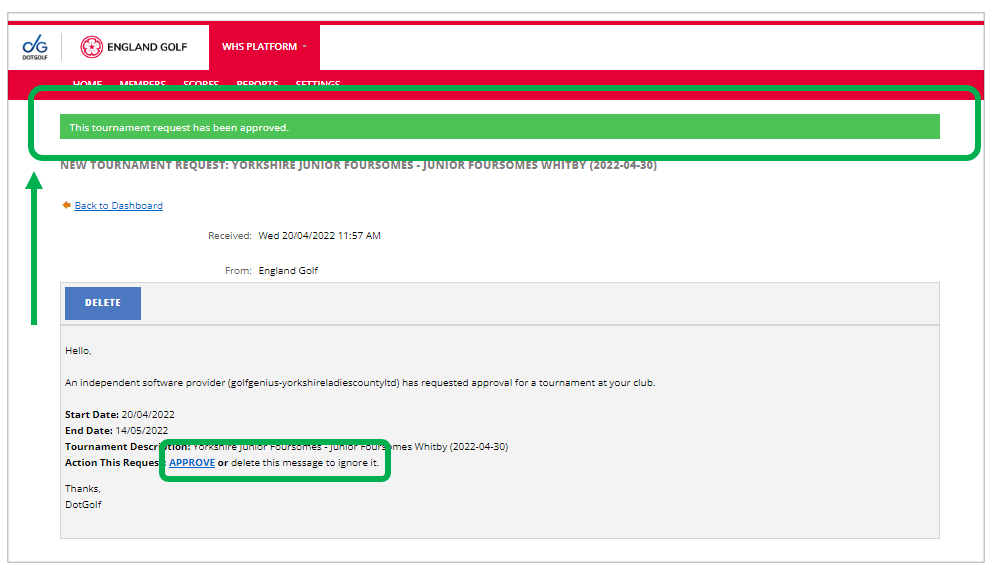 Note there is no ‘declined’ marker, as the tournament request prompts either accept or delete, in which case the request disappears from the inbox. If the email is still present but without the marker/header showing approval, it has therefore not been actioned yet.