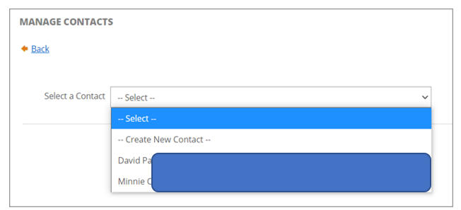- Select ‘Manage Contacts’ to update any of the contact information displayed or to add a new contact by selecting the relevant option from the drop-down list: