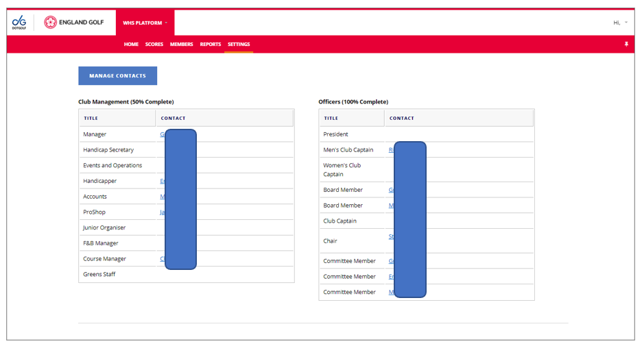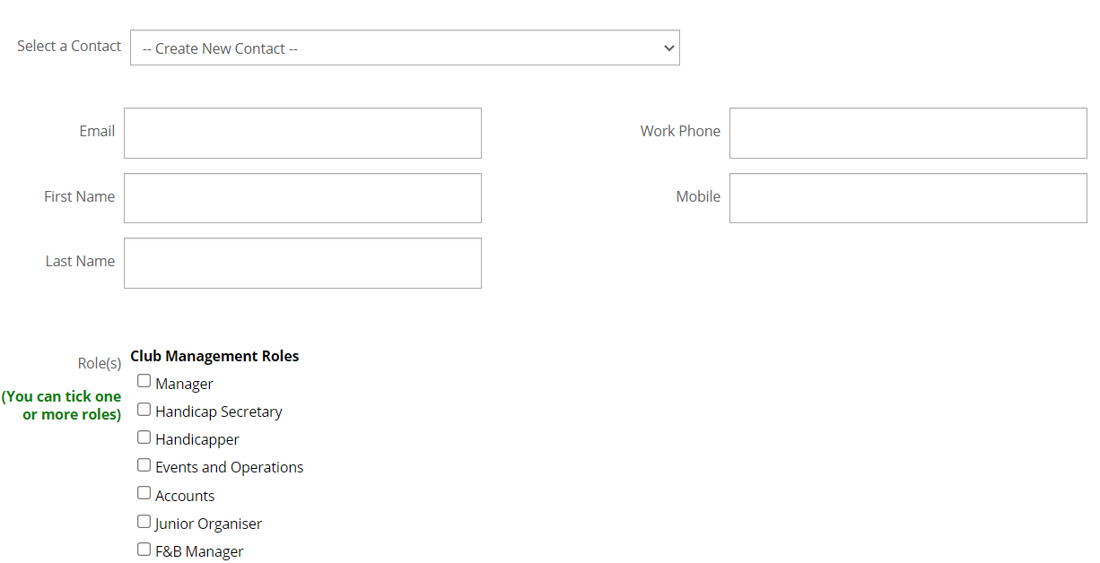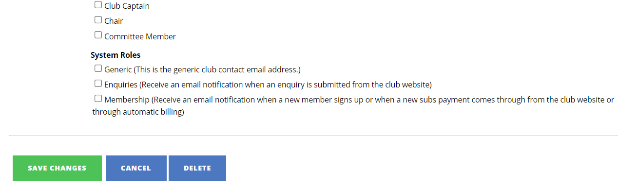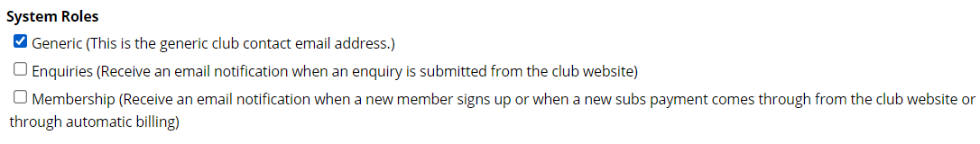 NOTE: at least one contact (preferably the Club Manager or Secretary) should have ‘Generic’ selected in System Roles – this is displayed at the bottom of the ‘Contacts’ page: