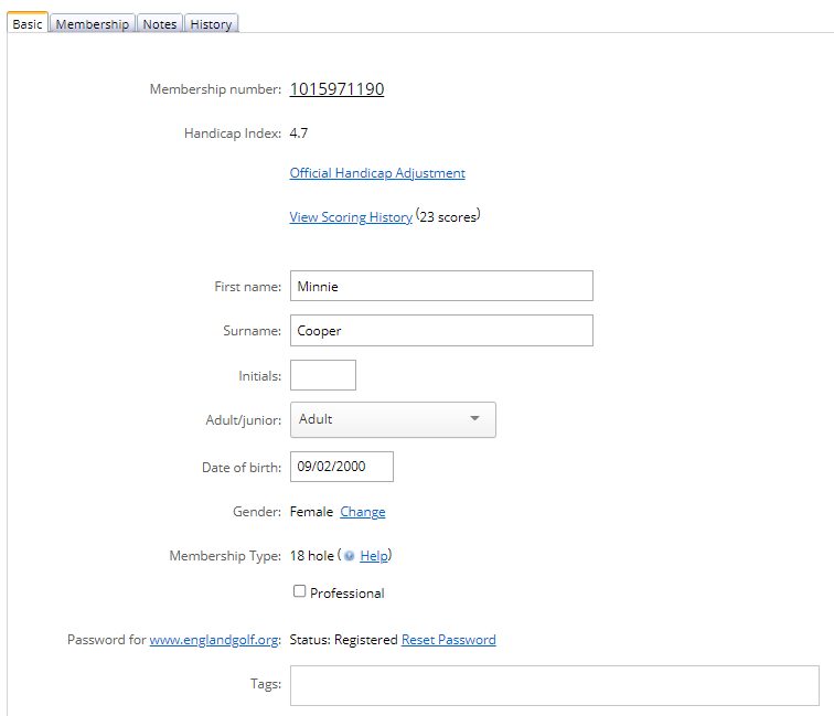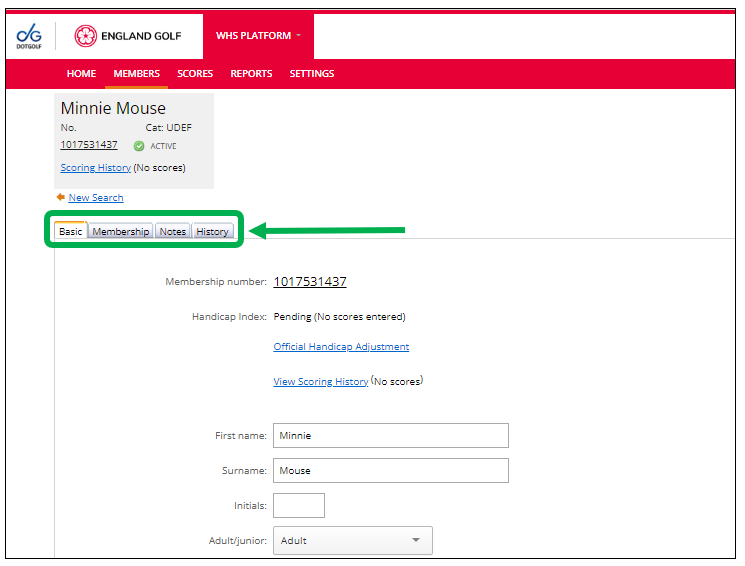 Following the member search, within the member record there are four tabs / menu options which are: Basic; Membership; Notes; and History: