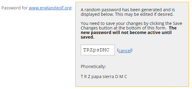 - If you want to enter a different password, for example one chosen by the member, you can overtype the random password with the alternative password and select ‘Save Changes’ at the bottom of the page: