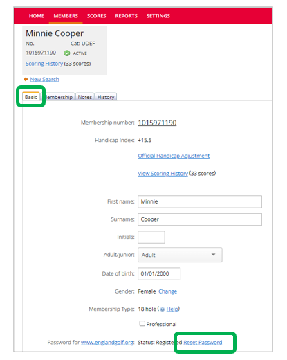 - Select ‘Reset Password’ within the member’s Basic tab: