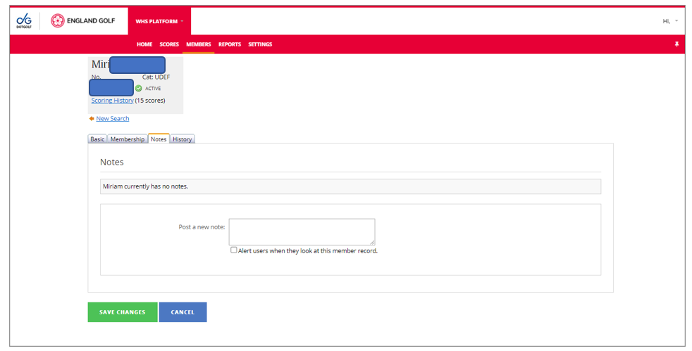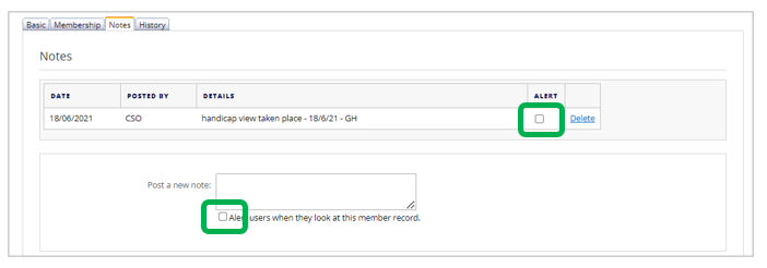 - Add a membership note – which you can make visible to other users at the club by ticking ‘Alert’ tick box if needed: