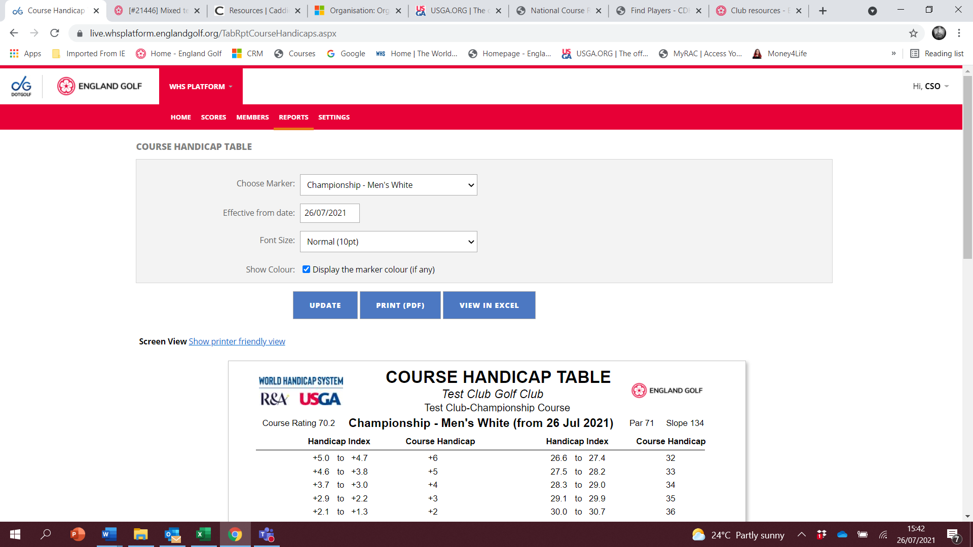 These tables are compiled via the tee data within the WHS portal for each club and can be located within the handicaps reports ‘WHS Course Handicap reports. There are then a series of dropdowns and settings that can be configured – see image below.