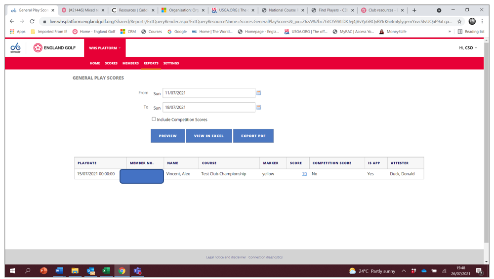 This report displays all the general play scores submitted to WHS. The attester’s name is the player who formally approved the score, via the England Golf app. Any score with no attester name listed, will have been approved by third-party app/software.