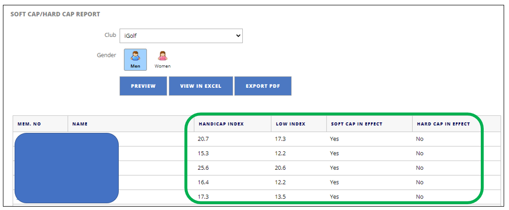 This report is used to establish which members have had either a soft cap or hard cap applied to their Handicap Index.